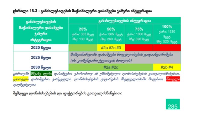 ხშირად ნამოხვანჰესის პროექტის გამართლება განახლებადი ენერგიების განვითარების არგუმენტითაც კი ხდება. ის, რომ ამგვარი საბალანსო სიმძლავრეები დღესაც გააჩნია ჩვენს ელექტროსისტემას ცხადად ჩანს სწორედ მათ მიერ გამოქვეყნებულ საქართველოს გადამცემი ქსელის ათწლიან გეგმაში 2021-2031, დოკუმენტის 285-ე გვერდზე, ცხრილში 18.3. სწორედ მათი დასკვნის მიხედვით 333 მეგავატი ქარისა და 133 მეგავატი მზის ენერგიის დაშვება შესაძლებელია უპირობოდ, ან უმნიშვნელო ღონისძიებების გათვალისწინებით“, – აღნიშნულია ბექა ნაცვლიშვილის განცხადებაში.