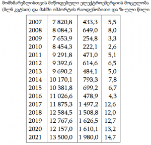 ნოემბერ-დეკემბერში მომხმარებლისთის მისაწოდებელი ელექტროენეგიის მოცულობის ოქტომბრის დონის შეანარჩუნების შემთხვევაში და 2021 წლის განმავლობაში მომხმარებლისთვის მიწოდებული ელექტროენერგის მოცულობა 13500 მლნ კვტსთ-ს, ხოლო მასში იმპორტის წილი 1 980 მლნ კვტსთ-ს მიაღწევს.