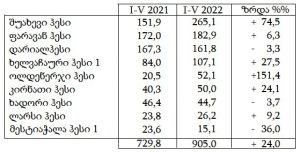ესკოს მონაცემების თანახმად, 2022 წლის მაისში ჰიდროსადგურების მიერ გამომუშავებული 1,452744 მლრ კვტსთ ელექტროენერგიიდან მარეგულირებელი სეზონური ჰიდროსადგურების წილად მოდის 42,4%, რაც შეადგენს 615,276 მლნ კვტსთ-ს.