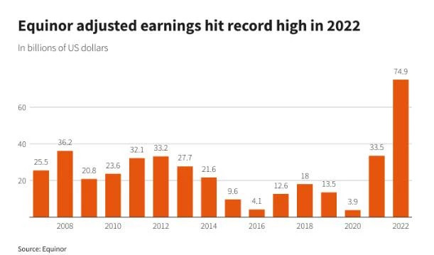 ნავთობისა და გაზის ნორვეგიული კომპანია „ეკვინორის” წლიურმა საოპერაციო მოგებამ 74,9 მილიარდი დოლარი შეადგინა, რაც შარშანდელ მოგებას 2,2-ჯერ აღემატება.